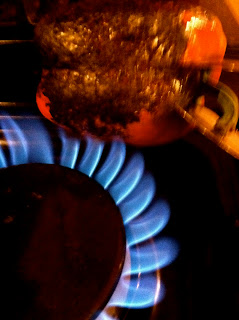 First start by roasting 1 red pepper. Since I have a gas stove I do it over the open flame. I take a metal tongs and wedge it into the top of the pepper around the stem. Unlike roasting a marshmallow, hold the pepper right on the flame. It will pop as the skins begins to blacken. Continue rotating the pepper until it is entirely black.
